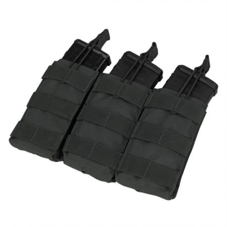 Condor's Triple M4/M16 Open-Top Mag Pouch is a convenient modular attachment that can hold three M4 or M16 magazines comfortably and securely. This mag pouch is ideal for tactical belts, battle belts, or tactical vests, since the elastic pull-tab cords make the entire pouch adjustable. Made from a durable nylon material, this pouch is tough, with riveted holes at the bottom to allow sand and other particles to drain out. Mag placement is easy and mag retrieval is quick, as the tops of the pouch open rapidly for situations in which speed is paramount. Magazines sit securely in the spaces, making this a safe ammo holder, and there is also MOLLE webbing along the front, perfect for attaching extra gear.