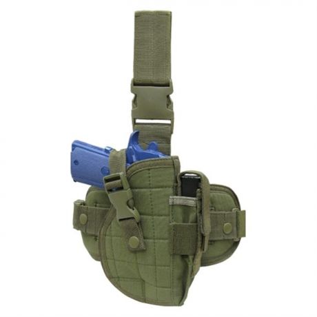 The Universal Leg Holster is designed primarily for easy attachment and detachment, as well as ensured comfort during periods of extended use. It's fully adjustable with a hook-and-loop system in order to suit a wide range of handguns. The padded holster protects the weapon effectively, and the adjustable leg strap comes with a non-slip rubber lining to securely keep the holster in place. The attachment buckle gives the user the opportunity for quick release when needed. The magazine pouch comes with an adjustable option, making a convenient pocket to store an extra magazine. On the back there are attachment straps that can be attached onto the belt.
