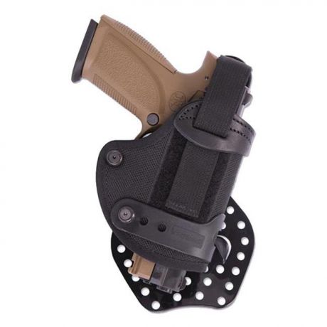 The Concealment Paddle Holster is Elite Survival Systems' most convenient solution for concealed-carry. Its "paddle" design allows the user to put the holster on by simply slipping the molded paddle inside the waistband, and removing the system is just as quick and easy. It does not require the user to remove their belt. Unlike many clip holsters, Elite Survival Systems' paddle holster combines convenience with stability as a result of its contoured paddle with dual stabilizer prongs. It is constructed of a combination of leather and padded ballistic nylon. The holster has a bobbed muzzle design to maximize concealability, as well as a patented adjustable PowerBand tension device. It also has a hook and loop adjustable ThumBreak retainer strap and patented SightStrip to protect the sights. This holster offers the convenience necessary for many who carry concealed.