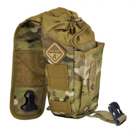 Initially developed for carrying spare assault rifle magazines, the Hazard 4 Flip Bottle Pouch provides reliable storage space for everything from water bottles to batteries and walkie-talkies. Constructed from water-resistant 1000-denier Cordura, this pouch secures contents with a drawstring gusset on the top, a lock-button and a wind-resistant flap. An expanding, accordion-style front pocket holds small accessories, and a MOLLE webbing/belt snap system on the back attaches to any compatible modular pack or bag. The front of the pouch has a loop field for attaching patches or IDs, and the side has an additional MOLLE area for the addition of smaller pouches.