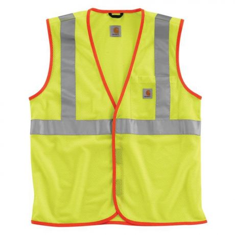 Stay cool while remaining visible in the Carhartt Hi-Vis Class 2 Vest. The lightweight polyester mesh material ensures ultimate breathability so that you remain cool and comfortable. A hook and loop closure allows it to easily go on or off and adjust to wear over bulkier sweatshirts. The left chest pocket allows you to conveniently keep important items close to you while keeping your hands free to work. Triple-stitched main seams mean that this vest is durable and will last, and the 3M Scotchlite Reflective Material meets strict safety standards to ensure that you’ll be seen. This vest meets ANSI / ISEA 107-2010 standards.