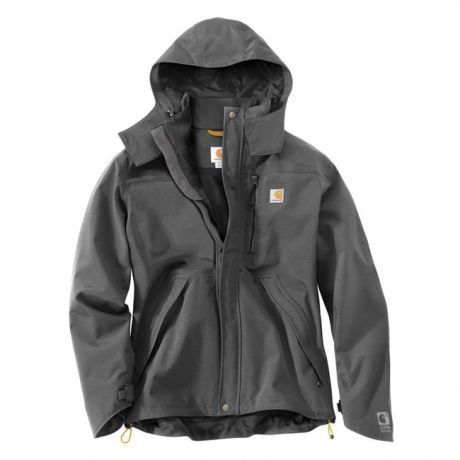 The field-tested Carhartt Shoreline Jacket is the top choice for staying dry and comfortable when working in wet conditions. Made with a durable nylon oxford shell, this jacket seals out the elements thanks to a waterproof Storm Defender membrane and water-repellent Rain Defender technology. The snap-on visored hood has an adjustable drawcord and can be removed from the jacket as needed. The body is lined with breathable polyester mesh, and the sleeves and hood feature a nylon taffeta lining for maximum comfort. A map pocket on the left chest uses a waterproof zipper closure to protect important documents. The jacket is fastened with a heavy-duty front zipper and uses interior and exterior storm flaps to provide additional protection from inclement weather.