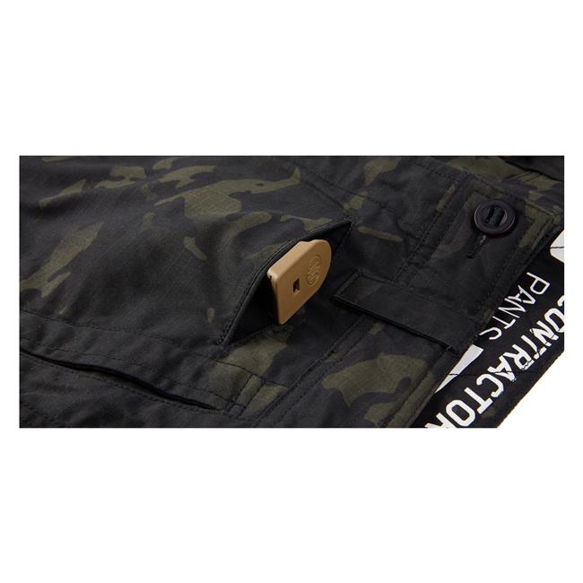 Based on our proven Contractor AF pant chassis, the Contractor MC blends lo-vis battlefield functionality with high-durability NyCo Multicam textiles. The padded waistband takes the bite out of heavy war belts. Articulated knees and gusseted crotch allow for maximum range of motion without binding. Internal thigh cargo pockets for essential storage without external bulk. And the dual-puller crotch zipper ensures you can conduct drainage operations without having to de-militarize your waistline.