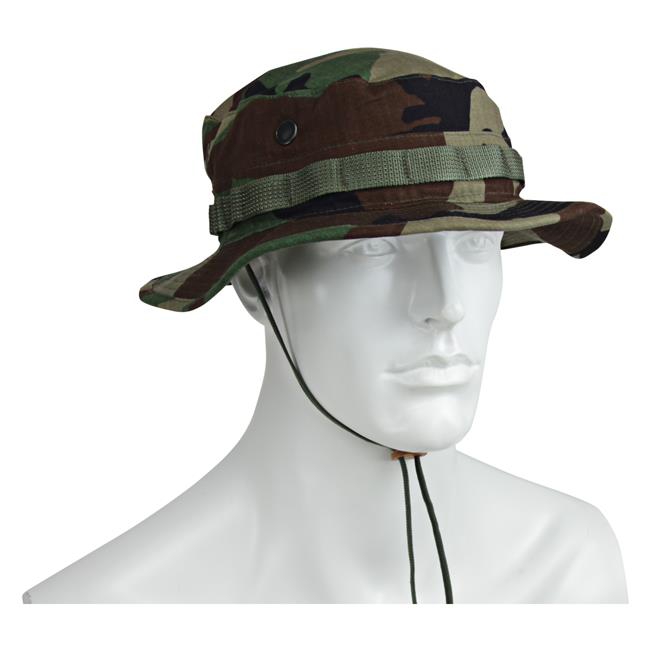 Propper's Mil-Spec Boonie Hat is made from a durable cotton ripstop material that protects you from the sun. The wide brim blocks sunlight from your eyes and the material keeps you cool on hot days. There are branch loops made of a tough nylon webbing along the crown for durability. There are also bellowed drain holes on the crown for ventilation and a breathable interior. A leather keeper holds the hat in place when you sweat or are in motion and the adjustable chin cord allows for easy size customization. It also lets the hat be taken off and carried around the neck.