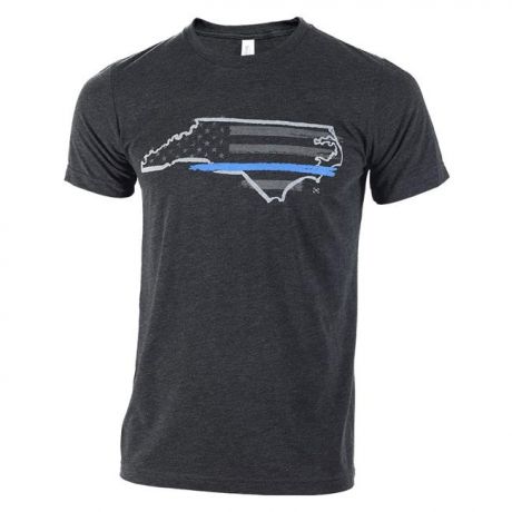 Support North Carolina law enforcement with this soft, comfortable performance tee. The graphic displays a distressed American flag with a single blue stripe, representing the relationship of law enforcement as the protectors of civilians, and as the line between order and chaos. The flag is layered over an outline of North Carolina—an exclusive design created by TG to show support for local officers. More than just a great tee, the TG Thin Blue Line T-Shirt shows respect to the men and women who keep our streets safe.